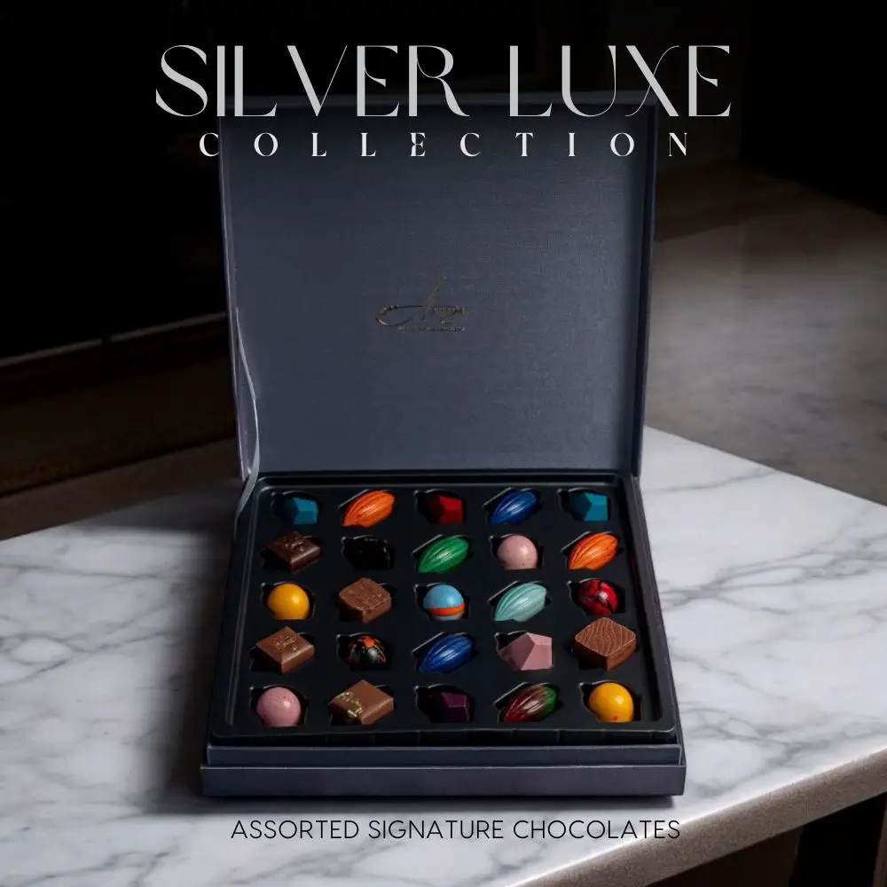 Our Silver Luxe Collection features an array of artisan chocolates, each piece made with the utmost care and attention to detail. From rich dark chocolate truffles to creamy milk chocolate delights, this box offers a variety that caters to every palate. Elevate your chocolate experience with gourmet flavors that include classic hazelnut, zesty orange, and luscious sea salt caramel, ensuring a delightful explosion of taste with every bite.